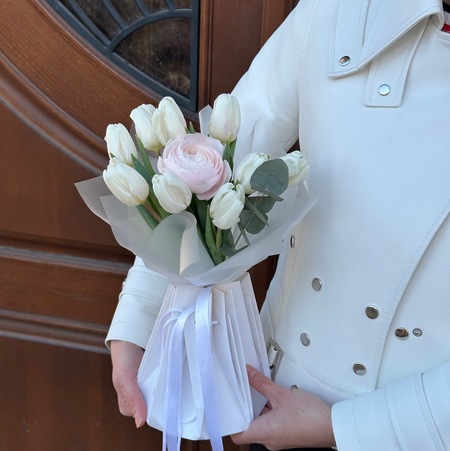Аквабокс с тюльпанами(10), ранункулюсом(1), эвкалиптом.