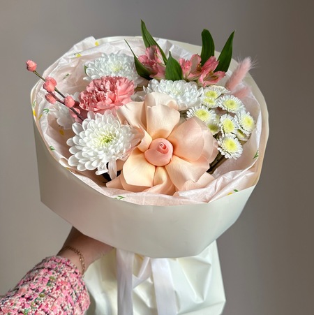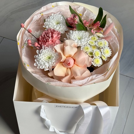 розовый:французская роза, диантус, альстромерия, хризантема алтай и сталион, котики(2), сухоцветы(2)