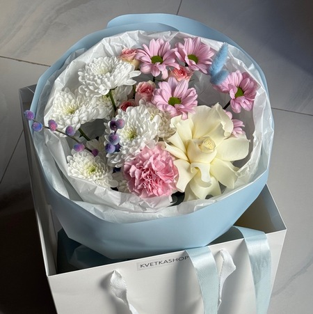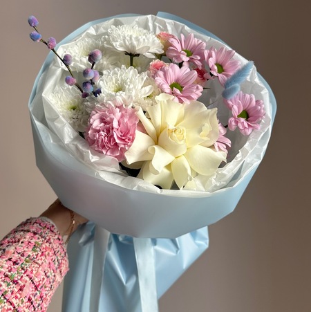 голубой: французская роза, диантус, кустовая роза динара, хризантема алтай и софтон, котики(2), сухоцветы(2)