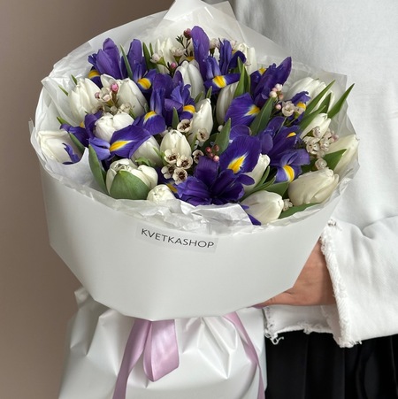 Белый тюльпан(20), ирисы(6), ваксфлауэр.