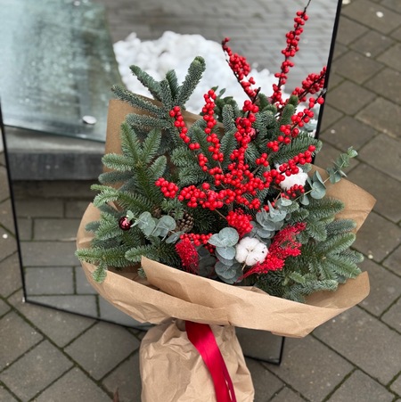 Зимний букет с нобилисом, илексом, хлопком(2), шариками, эвкалиптом, сухоцветами, шариками(2) в крафте.