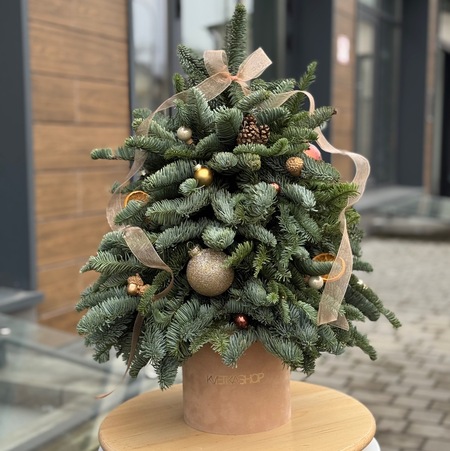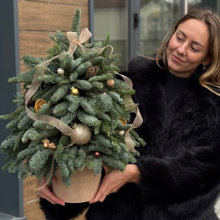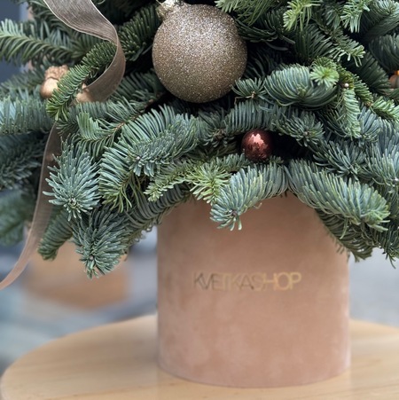 Елочка из нобилиса в фирменном боксе, украшенная шишками(2), желудями(6), апельсинами(3), шариками(4+11), бант.